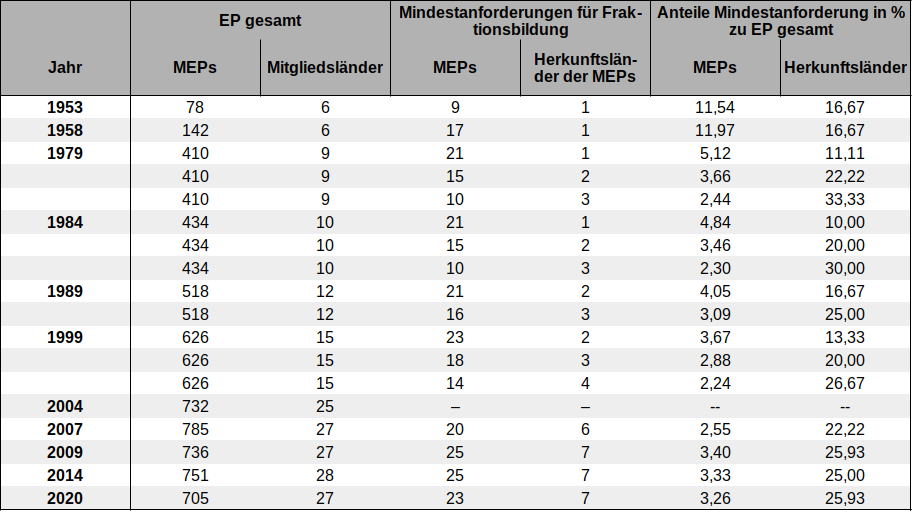 * Von 1958 auf 1979: Die Gesamtanzahl der EG-Mitgliedsländer erhöht sich um 50%, die Gesamtzahl der MEPs sogar um 188%. Die absolute Anzahl der für eine Fraktion erforderlichen MEPs steigt um nur 23%, die der erforderlichen Herkunftsländer gar nicht. Infolge fallen also die Anteile beider Quoren, allerdings nicht gleichermaßen, die Anzahl MEPs etwa um die Hälfte, die Anzahl Herkunftsländer etwa um ein Drittel.